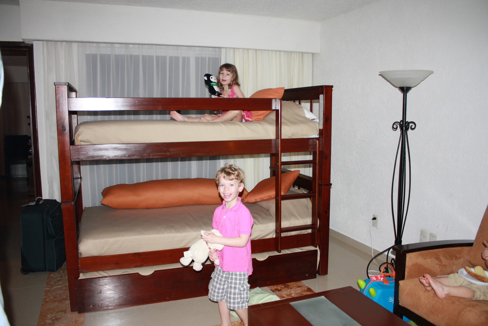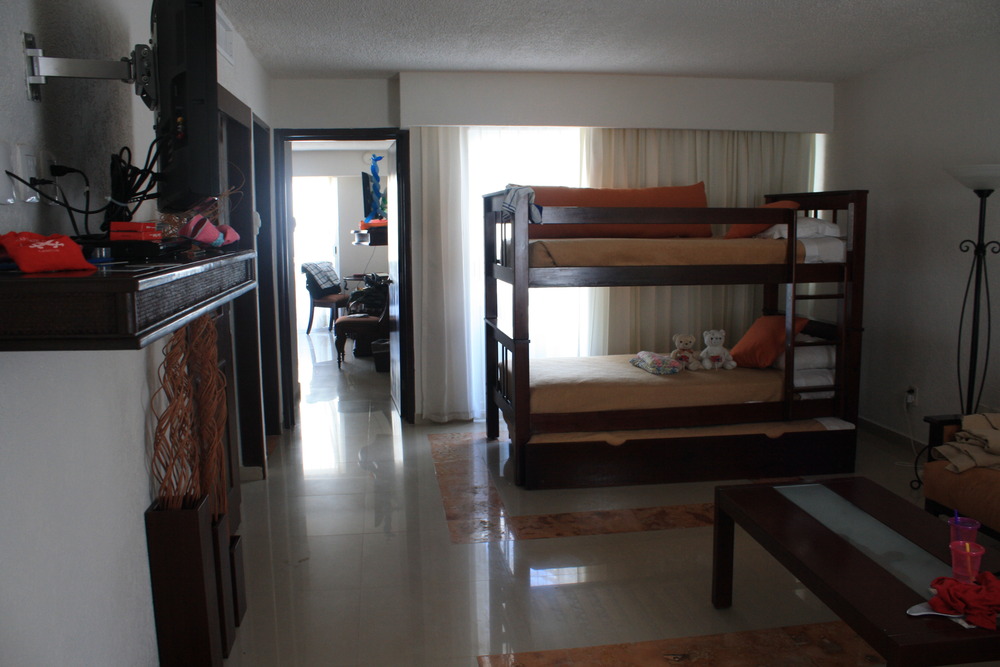 We arrived mid-afternoon and had no troubles with the transfer to the hotel, the Gran Caribe Real. When we first saw our room, although it was nice, it did seem quite small, so we took the offer to upgrade to a one-bedroom suite. After walking into the room, there was no doubt that we should switch. The room had the same bunkbed + trundle set up, but in the living room. The bedroom had a gorgeous king bed with more pillows that you can count and a big fluffy duvet. Each room had its own massive flatscreen which meant that we got a vacation from watching kids shows for a change! And the piece-de-resistance…..a Nespresso machine!!!!