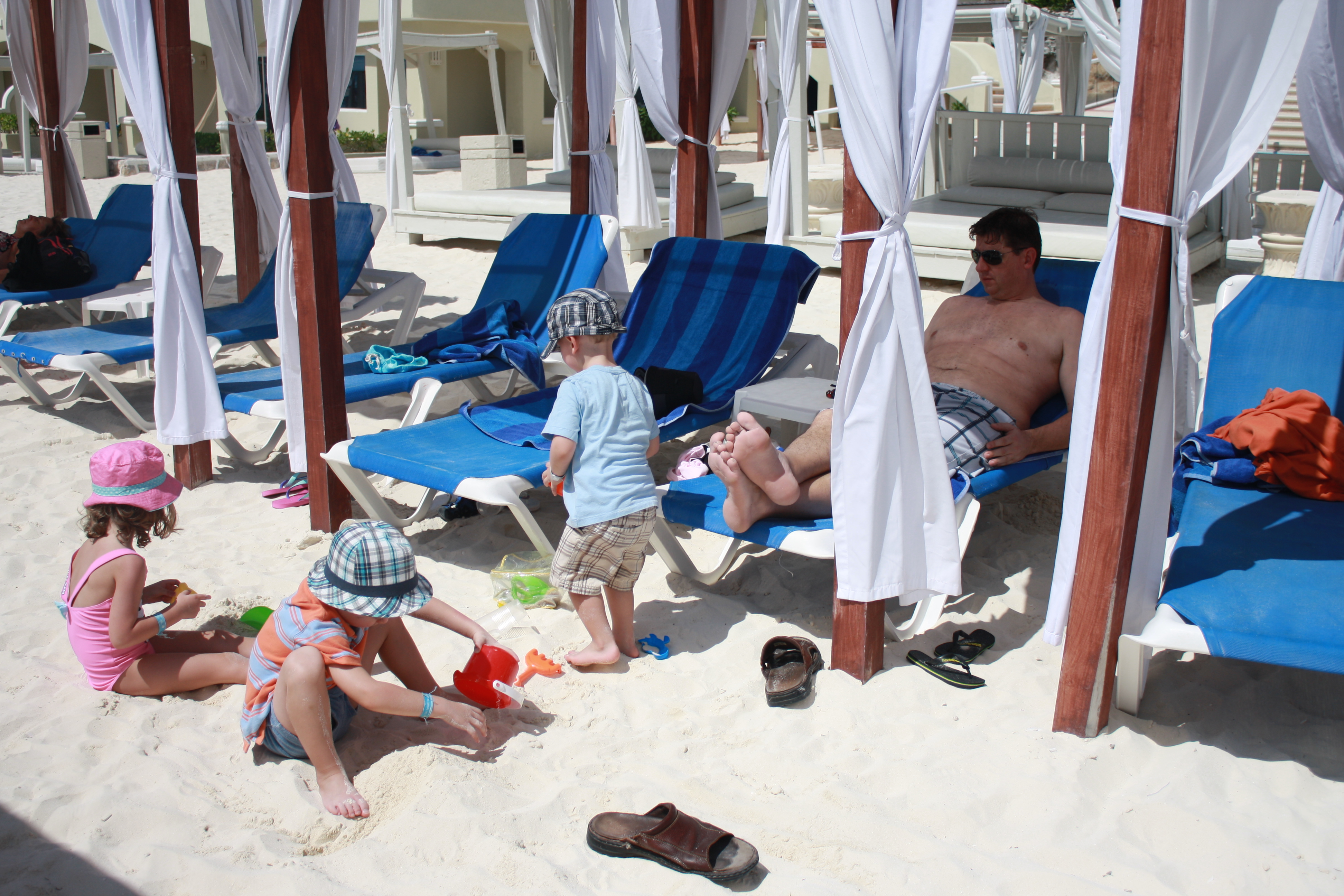 What can I say? Who doesn’t love perfectly turquoise blue warm waves crashing into powdery white sand. There is just nothing like it. Absolutely stunning backdrop and a blast for the kids. Ineke and Willem particularly enjoyed standing in the waves with Chris. Bas prefered to just play in the sand and build! The resort has hundreds of covered huts with lounge chairs and finding one was never a problem (at least in the mornings). I think by afternoon when all the springbreakers were waking up from their all-night partying it became a bit trickier to find.